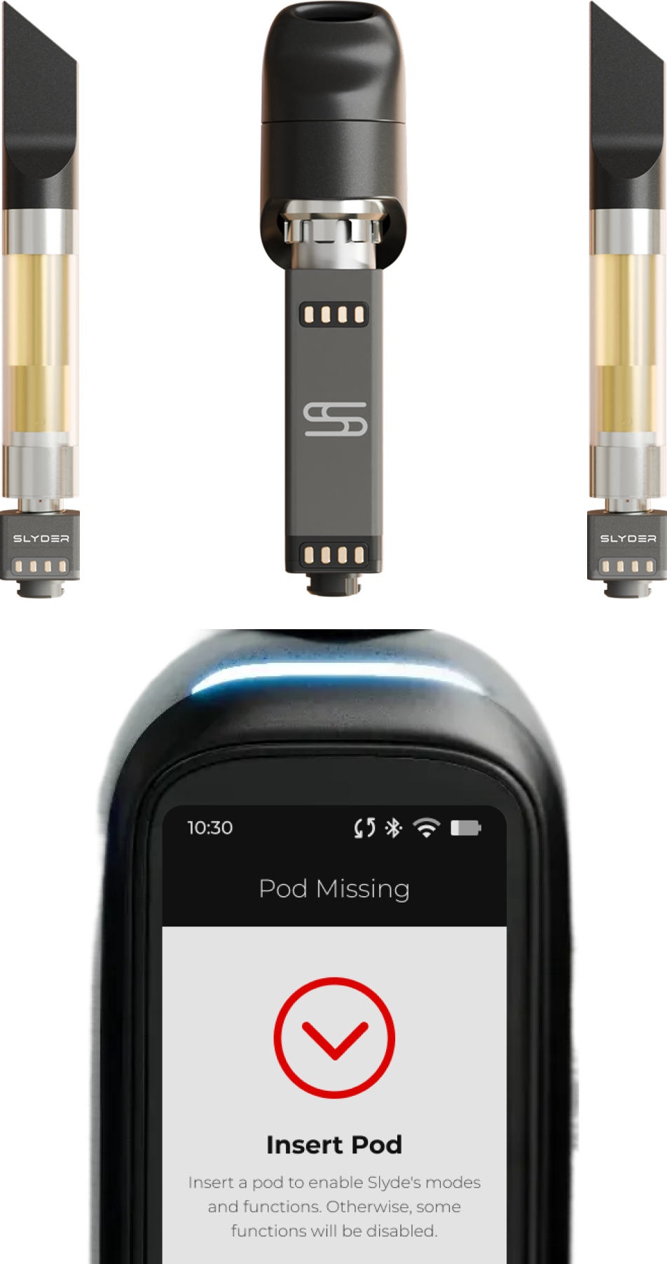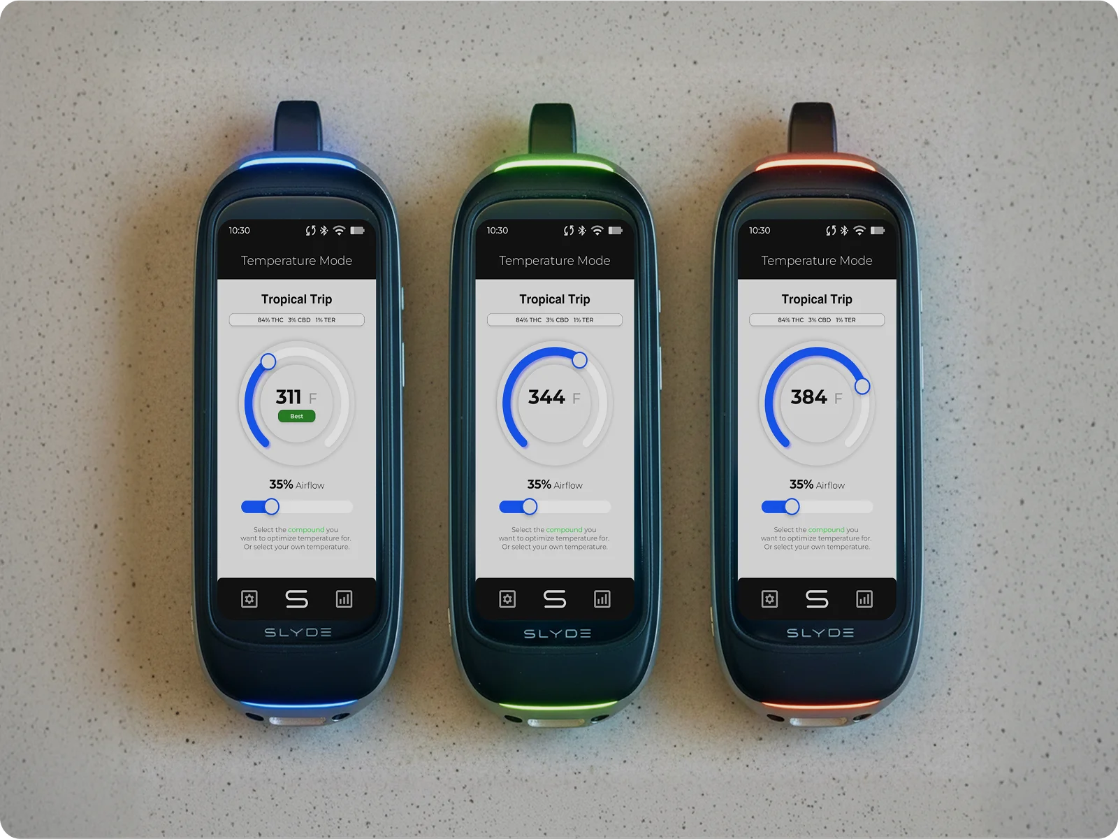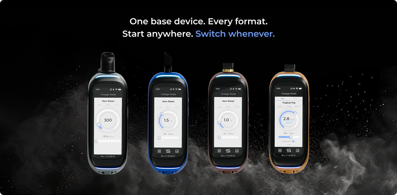 The mobile app gives you the same controls on your phone. Scan a pod or cartridge to pull product and compound information directly from the source. Review your data, adjust session settings, and dial things in before you start. Both platforms stay in sync through your SLYDER Pro account.